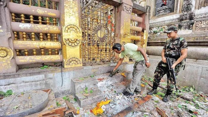 Five people, including two Buddhist monks, were injured when 10 bombs exploded in and around the Mahabodhi Temple complex, a UNESCO World Heritage Site in Bodh Gaya, on July 7, 2013, while three other explosive devices were defused by bomb-disposal squads.