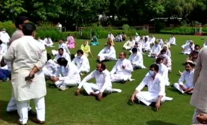 #WATCH Rajasthan: Congress MLAs supporting Chief Minister Ashok Gehlot sit and raise slogans at Raj Bhawan.